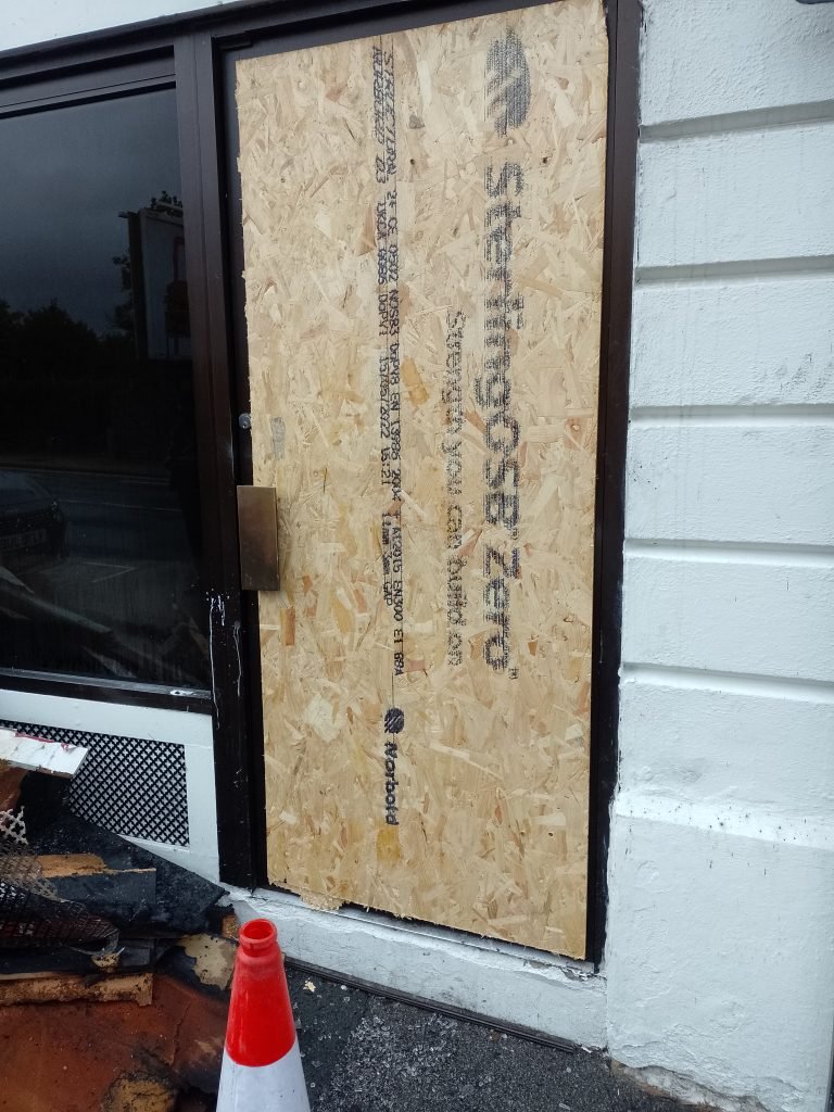 This is the after picture after the emergency boarding up was complete. We used 11mm board to ensure the property was nice and secure while the store waits for the new wall and glazing to be built. Only in Leeds. The property was nice and secure after we had finished with our high quality OSB wooden boards which protected the property and stopped people from going inside. We take great care to secure any property in a way which we would expect someone to secure our very own property should ours be damaged. We believe that everyone deserves to have their property protected properly and securely.